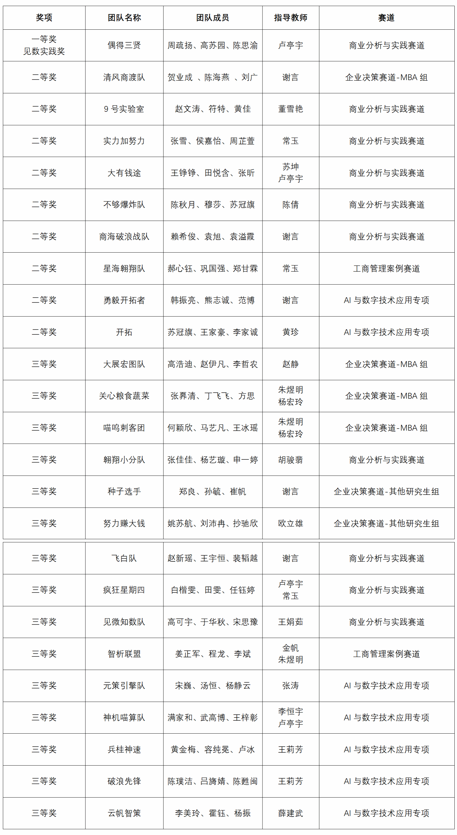 本届大赛聚焦数智时代企业管理核心挑战,设企业决策赛道,商业分析与实践赛道,工商管理案例赛道和AI与数字技术应用专项赛道,对参赛团队的理论应用、数据洞察与解决方案落地能力提出了更高要求。我院在各赛道均展现强劲竞争力,实现“多点开花”。商业分析与实践赛道不仅斩获全国一等奖1项、二等奖5项、三等奖4项,更凭借“偶得三贤”团队的出色实践应用成果,赢得命题企业高度评价,成功拿下该赛道最高荣誉“见数实践奖”,团队指导老师卢亭宇亦获评“优秀指导老师奖”。企业决策赛道收获二等奖1项、三等奖5项;工商管理案例与数字技术赛道获二等奖和三等奖各1项;AI与数字技术应用专项赛道获二等奖2项、三等奖5项。